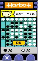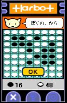 先日、寒月が金にものを言わせて刈人をパワーアップさせまして ゲームが出来るようになりました。 さて、そんな訳で寒月の所にオセロをしに行きました。 ゲームをすると言うと後ろの方に駆けていく刈人。 普段はのろまの癖に遊ぶ時だけ機敏なのが妙にリアルで嫌。 等と思っている内にゲームが始まりました 俺>ふ、まぁ相手は餓鬼だしいっちょ、遊んでやるか ご存知の通りハーボットはベビーフェイスな為幼児扱いをしてしまいます。 ゲームの序盤は俺が真ん中の四角内を重点的にとりに行き刈人が守るといった感じだった でしょうか。。。。。。。 中盤にかけても圧倒的に俺(黒)が多く その差は30以上 ふ・・・・・・餓鬼相手に本気になっちまったぜ・・・ 早々と勝利の余韻に浸る俺。 しかし残り15枡程の所で気がついたのです。 置く場所がねぇ・・・・・・ 黒が圧倒的に多いので 挟める白がないのです。 そこからが凄かった。数は少ないものの真ん中に効果的に置かれた白を使い パスをするしかない俺の黒をばしばし白にしていく刈人。 気がつけばコーナーに黒を置かざるをえない展開においこまれ角を二つ取られてしまう。 こうなると最早勝ち目はない・・・・・ 血の通った人間なら辞める? と一言聞く所だろう・・・ しかし こいつは ↓ この後待っていたのは一方的な試合展開、下の黒を全部白にされ真ん中の黒も全て白に。 この後待っていたのは大量虐殺でした しかも、これほど圧倒的な差で勝利していながらわざわざ自分の勝ちを宣言する刈人。 見たらわかるわ!ヴォケェっ! はい、すいません負け犬の遠吠えです。 大家には麻雀で狩られ 店子にはオセロで狩られ ちょっと冬の寒さが見に染みた一日でした エヘ |